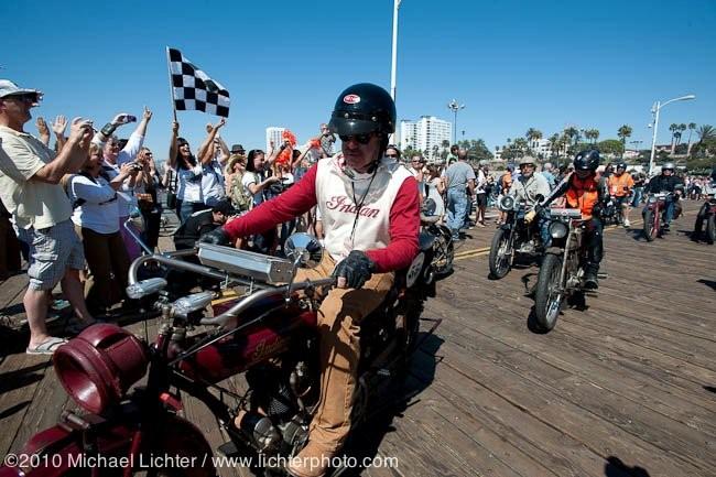 My recent accomplishments on Indians include my participation in the first organized group Cannonball run for Antique motorcycles by promoter Lonnie Isam Jr. in 2010. The coast to coast run started at Kitty Hawk NC and ended on the Santa Monica Pier in California. The ride was established for motorcycles 1915 and older. I rode my 1915 Indian known as “War Eagle” and had the pleasure of riding with Cris Sommer Simmons, notably the most famous woman motorcycle rider living, who rode a 1915 Harley known as “Effie”.